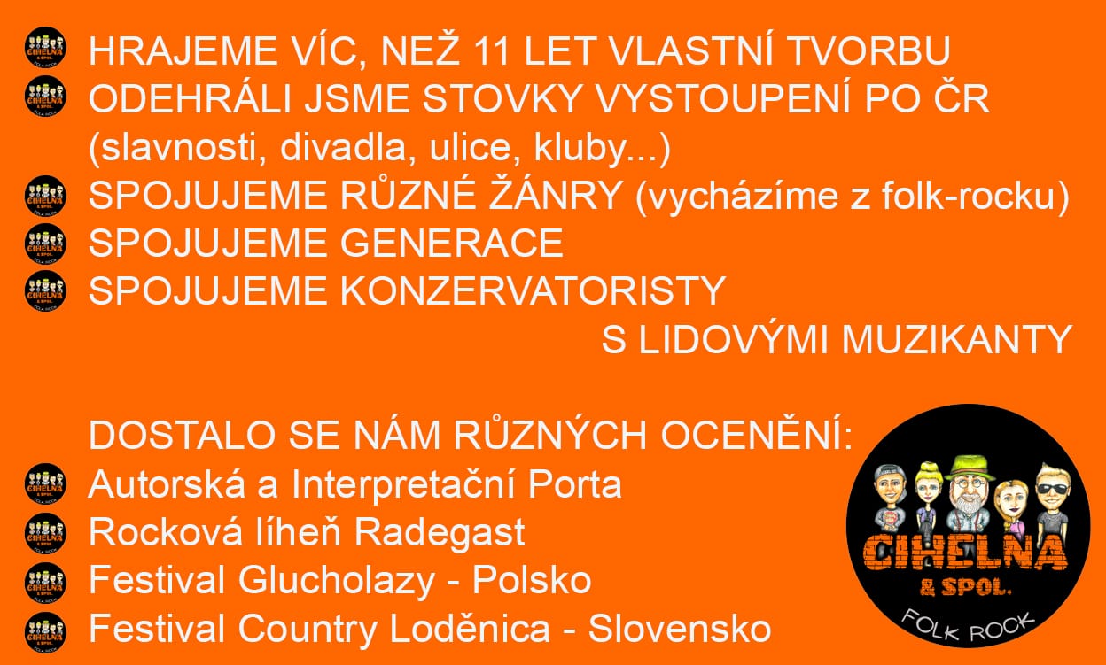 Folk-rocková kapela od břehů Lužnice, která v roce 2025 oslavila 11 let na scéně. Repertoár tvoří především vlastní písně. Za těch 11 let spatřilo zvuk Světa více, než 45 "cihelních" skladeb, jejímiž autory jsou otec Máca a dcera Magdaléna Cihlářovi. Aktuálně stojí Cihelna & spol. na symbióze vzdělaných konzervatoristů a lidových muzikantů.